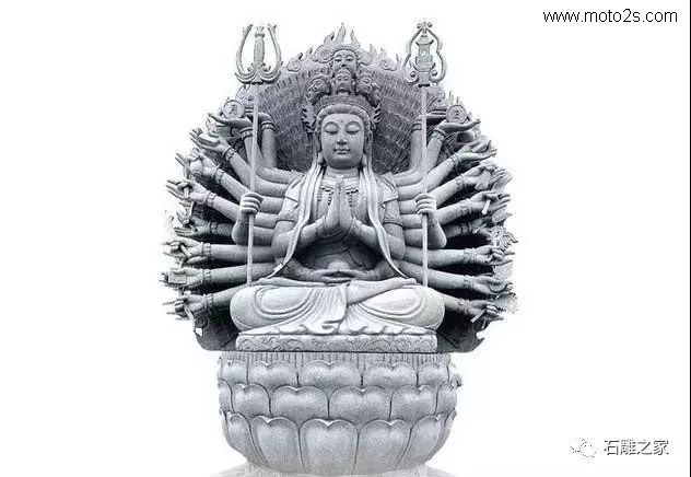 石雕千手观音的全称是“千手千眼观音”或“千眼千臂观音”,是密宗的六观音之一。千手观音的"千只手"如扇面形排列几层,有如孔雀开屏一般,十分壮观。过去在北京人的一些家里,多供奉着一张《千手观音》像,只见那观音立于莲花宝座之上,头梳发结,身披袈裟,戴佛冠,赤双足。面带慈祥,端庄而静雅。千手表示遍护众生,千眼则表示便观世间。