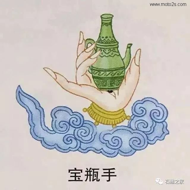 宝瓶手:空瓶又称军持,代表能调和家眷,使亲情和睦,没有纷争。