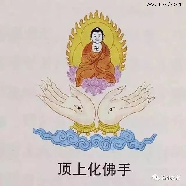 顶上化佛手:二手托释迦摩尼佛像,可得诸佛摩顶授记,生生不离佛。