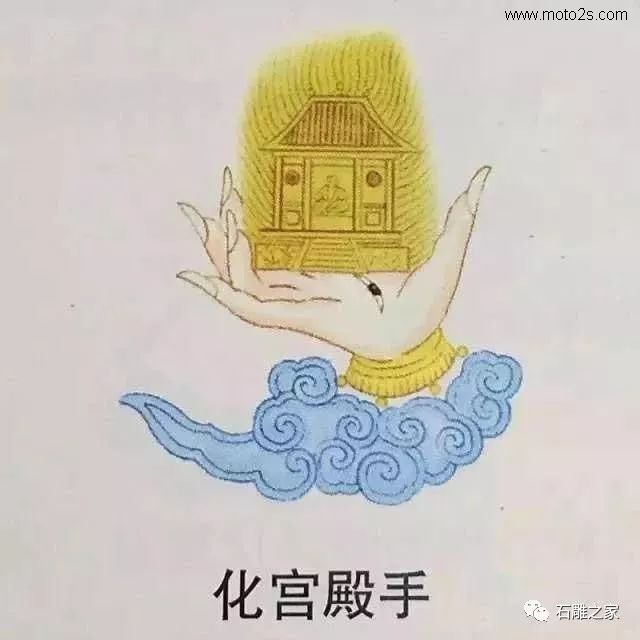化宫殿手:手持宫殿,代表生生世世在净土佛国中,不坠人世。