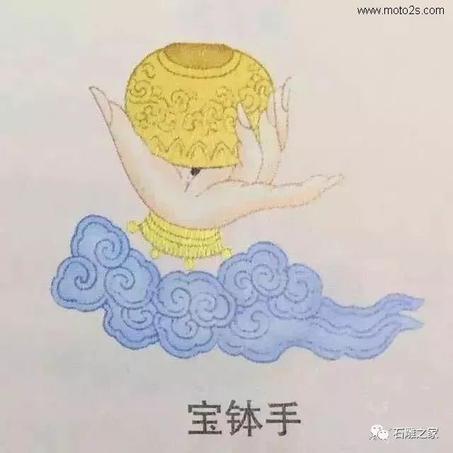 宝钵手:持钵,表示能使信仰者听到妙音,身心欢喜,远离病苦。