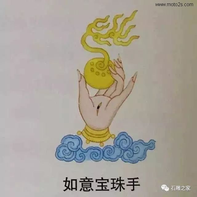 如意宝珠手:如意宝珠是转轮圣王的七宝之一,手托如意宝珠,可令信仰者富裕美满、安乐祥和。