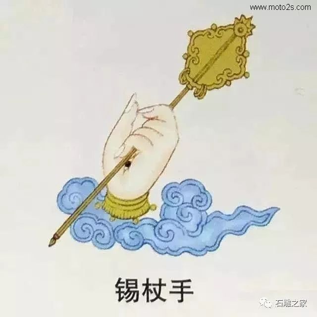 锡杖手:持锡杖,表示慈悲抚恤众生,令其安乐无忧。