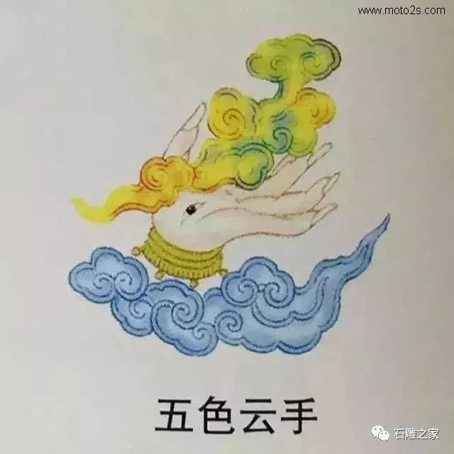 五色云手:托五色云,其中白色代表精进,黑色代表禅定,青色代表戒、定、慧。此手代表能令信仰者速成佛。