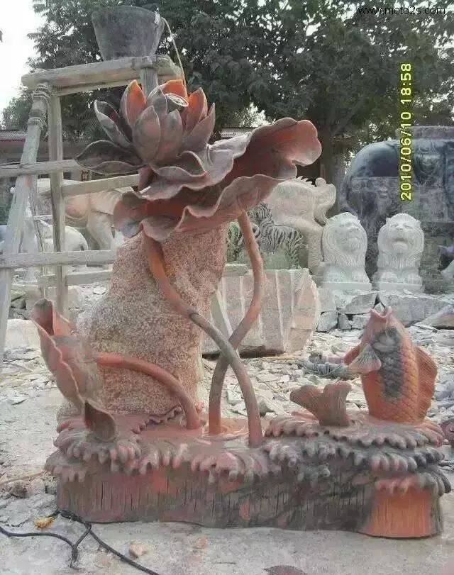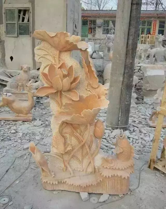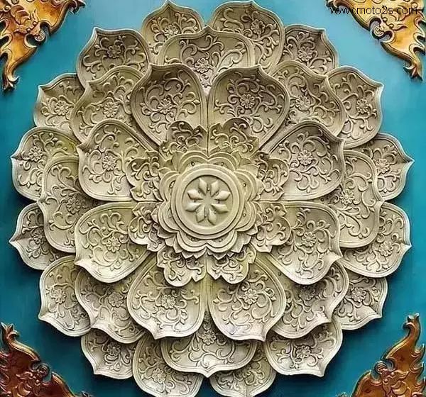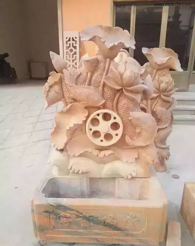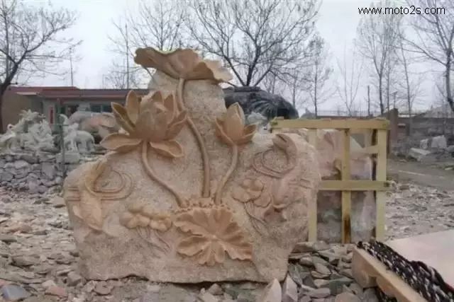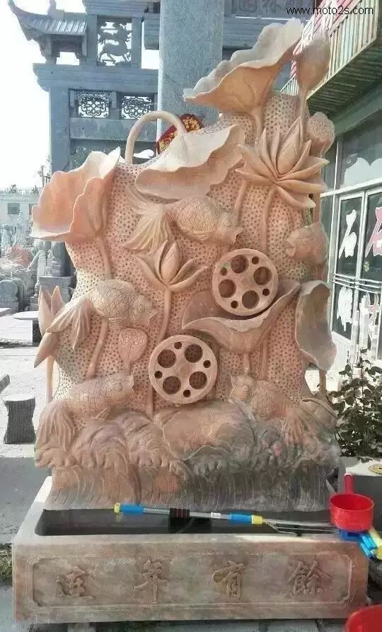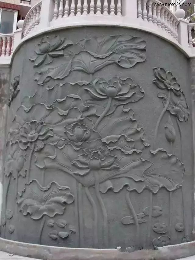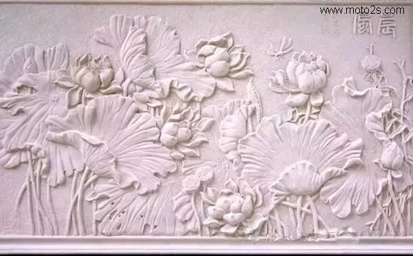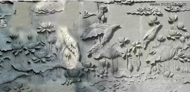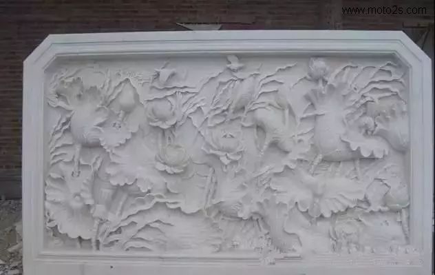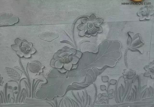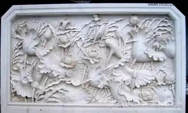 莲花纹饰形式多样,为石雕刻提供了丰富的题材,在石雕照壁中多采用浮雕工艺,寓意爱情美满、婚姻幸福、家庭兴旺。雕刻莲花,既可以用汉白玉、天青石种等质地细腻、高透明度的原料雕刻,也可以雕刻于颜色丰富的霞玉上,如红色俏雕为荷叶,春色雕刻莲花,粉红色雕刻成莲藕。