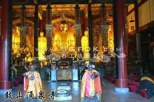 追溯中国佛寺供像的源流,唐代以前的很多石窟佛寺当中所供奉的佛像,一般正中的主尊佛像多为单尊,两旁则为协侍。主尊佛像形体高大,两旁的胁侍则相对较小之。至于三大像并列的供奉方式,以云岗第十窟与十七窟所供的三世佛为最具代表的遗例。就木造佛寺而言,晚唐以后逐渐流行于一殿一佛的格局,同时并立多尊佛像同为主尊的供奉式样,此种供奉式样一直沿袭下来,如唐代五台山佛光寺在东大殿供三佛同为主尊,山西大同下华严寺亦供奉三佛。而受到密教东传的影响,金元之际则开始流行供五尊像者。此后,只要寺院规模够大,必供奉三尊佛或五尊佛为主尊,明代以后,更成定制。 (资料来源:石工坊雕刻)