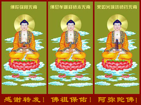(2)三身佛,即法身毗卢遮那佛、报身卢舍那佛、及应身释迦牟尼佛等。 (3)三方佛,即阿閦佛、毗卢遮那佛、及阿弥陀佛、或药师佛、释迦佛、及阿弥陀佛等。若是