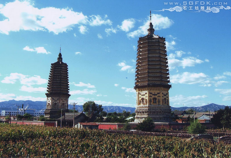 东塔高43.85米,西塔高42.63米,塔基为须弥座。塔座上有砖雕斗拱﹑栏板和仰莲等。栏板刻曲迟万字纹样。每角刻一力士,作负重状。塔身第1层圆形倚柱上有阑额,普柏枋,枋上为斗拱,斗拱每面补间3朵,转角2朵,为双抄五铺作计心造,斗拱上承塔檐。檐上覆筒板瓦,角脊上置兽,每面正中有砖砌拱形佛龛,内雕坐佛。东塔坐佛皆著宝冠,西塔南面一佛著宝冠,其余各面均作螺髻。龛外两侧各雕一胁侍。龛上雕有宝盖﹑飞天,并镶有铜镜。以上各层均用砖叠涩出檐,逐层内收,每面均嵌铜镜。塔刹有莲座﹑宝瓶﹑刹杆和宝珠等。由砖的质量及雕造技法上的差别可看出塔上雕饰后世重修加补的痕迹。1980年对塔基﹑塔座进行了部分修整。